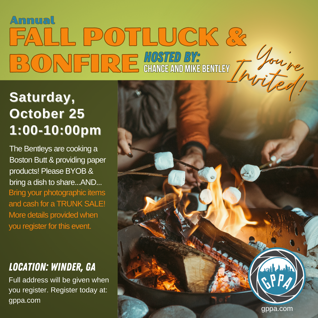 Join us for our most popular social event, the annual bonfire and pot luck hosted by Mike and Chance Bentley. This year we are adding a trunk sale! So come prepared to buy and sell. Sellers will donate 10% back to GPPA. Perfect opportunity to declutter your studio or storage unit as well as to build your business assets with new gently used equipment.
