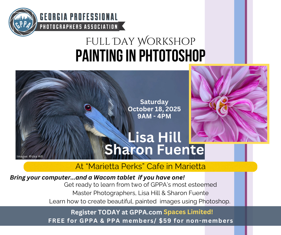 Lisa Hill and Sharon Fuente will walk you through the basics of creating beautiful painted images in Photoshop. You will learn what the different brushes and tools can do, create your own backgrounds and start your journey with new creative vision. This is an all day hands on class eligible for both PPA and GPPA merits. Bring your laptop! LIMITED SPACES AVAILABLE